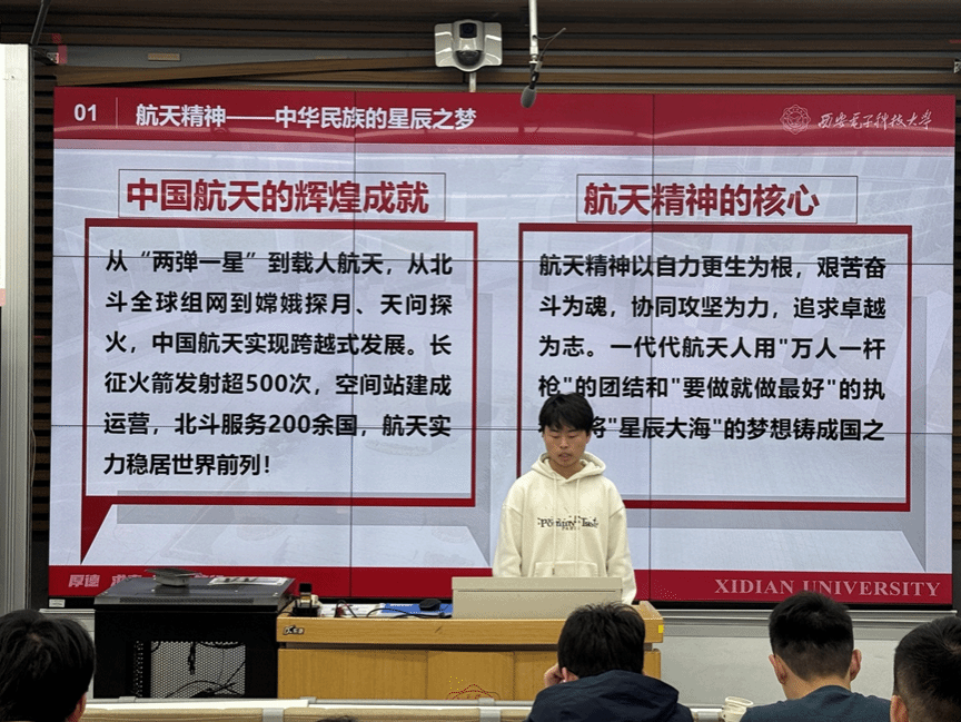 活动伊始,空间科学与技术学院研究生邱安豪以“仰望星空,脚踏实地——钱学森的航天报国路”为主题进行分享。通过详实的历史资料,他生动讲述了钱学森突破重重阻碍毅然回国、带领科研团队在艰苦条件下开创中国航天事业的感人经历。邱安豪讲到,钱学森等老一辈科学家所展现的“热爱祖国、无私奉献、自力更生、大力协同”的航天精神,是激励当代科技工作者砥砺前行的宝贵财富。他谈到,这种精神对于从事空间科学研究的青年学子具有特殊意义,鼓励同学们要将个人理想与国家航天事业发展紧密结合。
