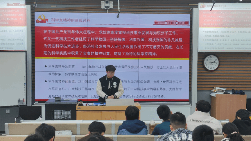 随后,应用化学系研究生党员张国翔以“从微观到宏观:王中林院士的创新之路”为题进行宣讲。他系统介绍了王中林院士在纳米能源领域取得的重大突破,详细讲述了其带领团队从基础研究到实现摩擦纳米发电机产业化的科研历程。张国翔提到,王中林院士在纳米材料研究中的创新思维和持之以恒的探索精神,深刻体现了科学家追求真理、勇攀高峰的执着信念。他号召同学们在应用化学研究中传承这种创新精神,注重学科交叉,勇于开拓。